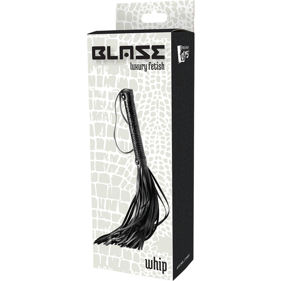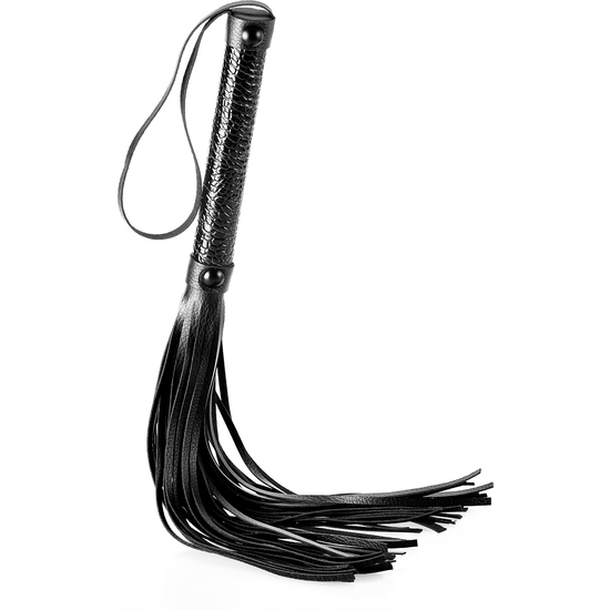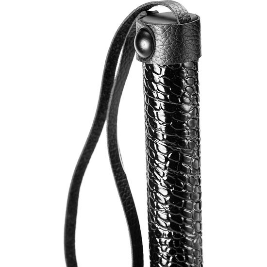 Flogger con 24 cm de largo de cadenas de imitación de cuero. Asa de fácil agarre hecha de material con aspecto de cuero con un elegante y brillante diseño de cuero croco negro. El flogger tiene una cómoda correa para la muñeca. Látigo negro con hebras de aspecto de cuero Fuerte y resistente mango Diseñado para satisfacer tus deseos más eróticos Traza suavemente el cuerpo de tu amante para construir anticipación, y construir hasta látigos cortos y afilados para excelentes placeres de alto vuelo.