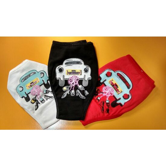 El dibujo estampado se trata de un coche de recién casados en color claro con detalles de purpurina, del que cuelgan divertidos accesorios.