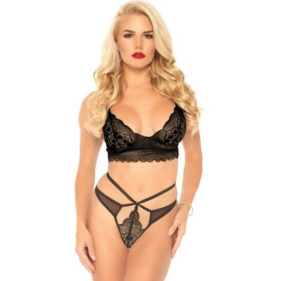Conjunto 2 piezas compuesto por sujetador de encaje estilo bralette con escote en V, y tanga a juego con detalle de mariposa en la parte delantera.