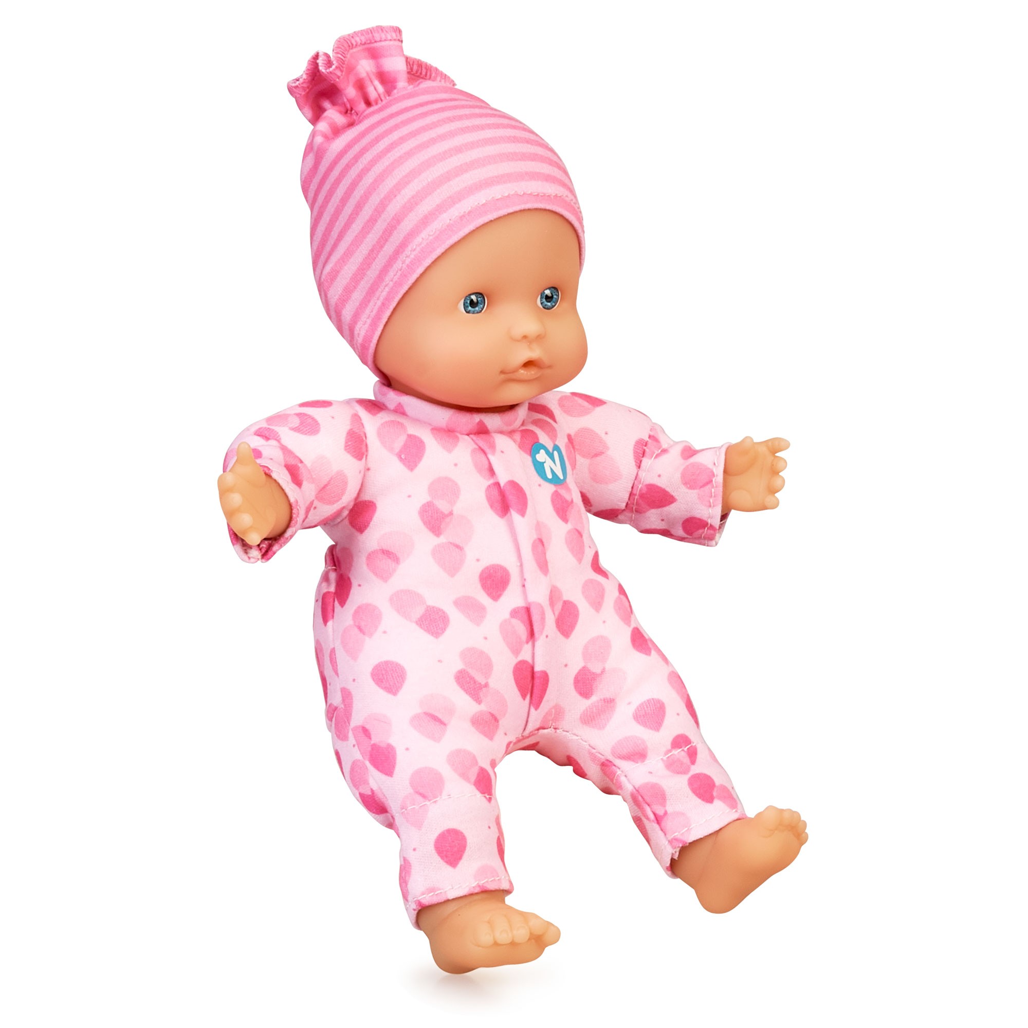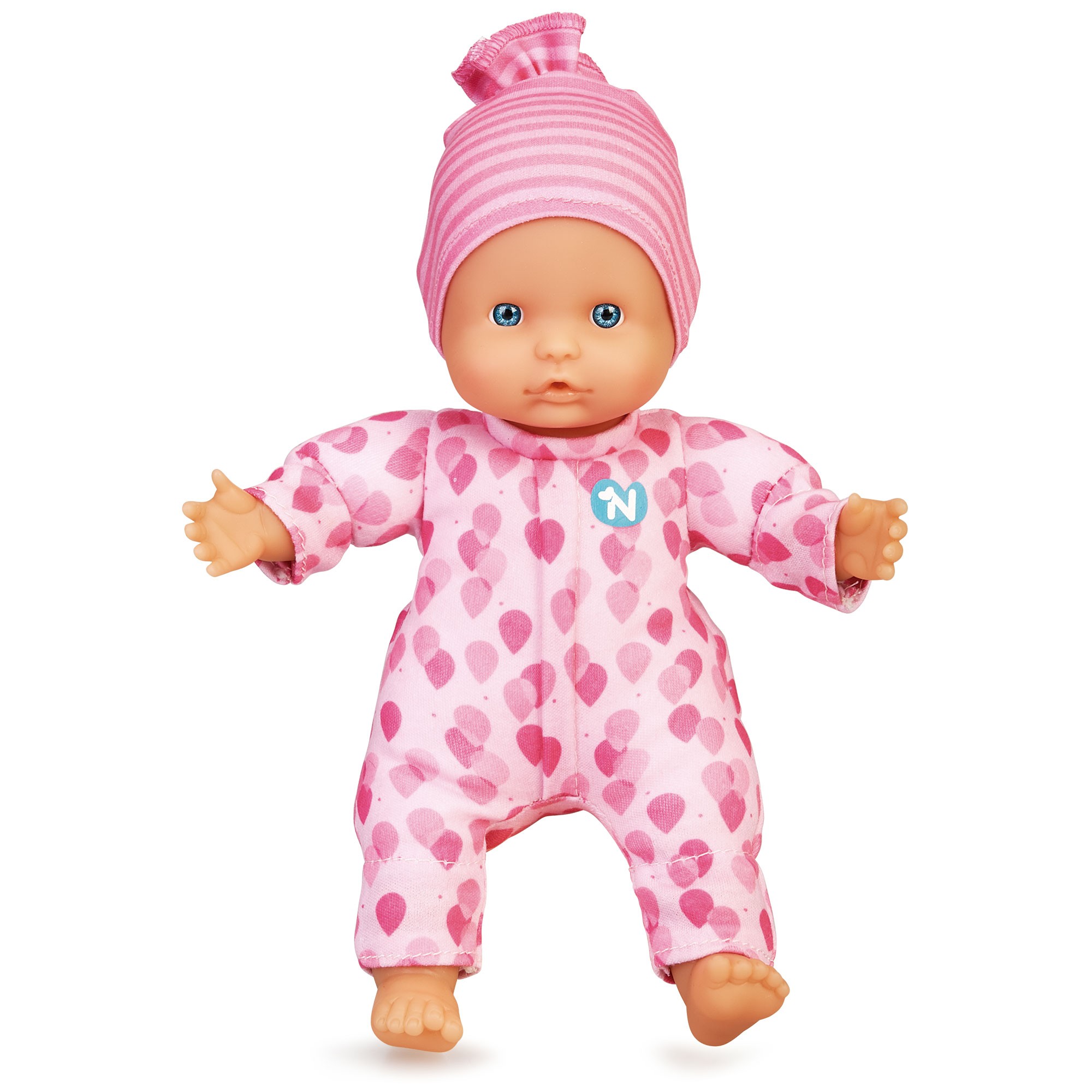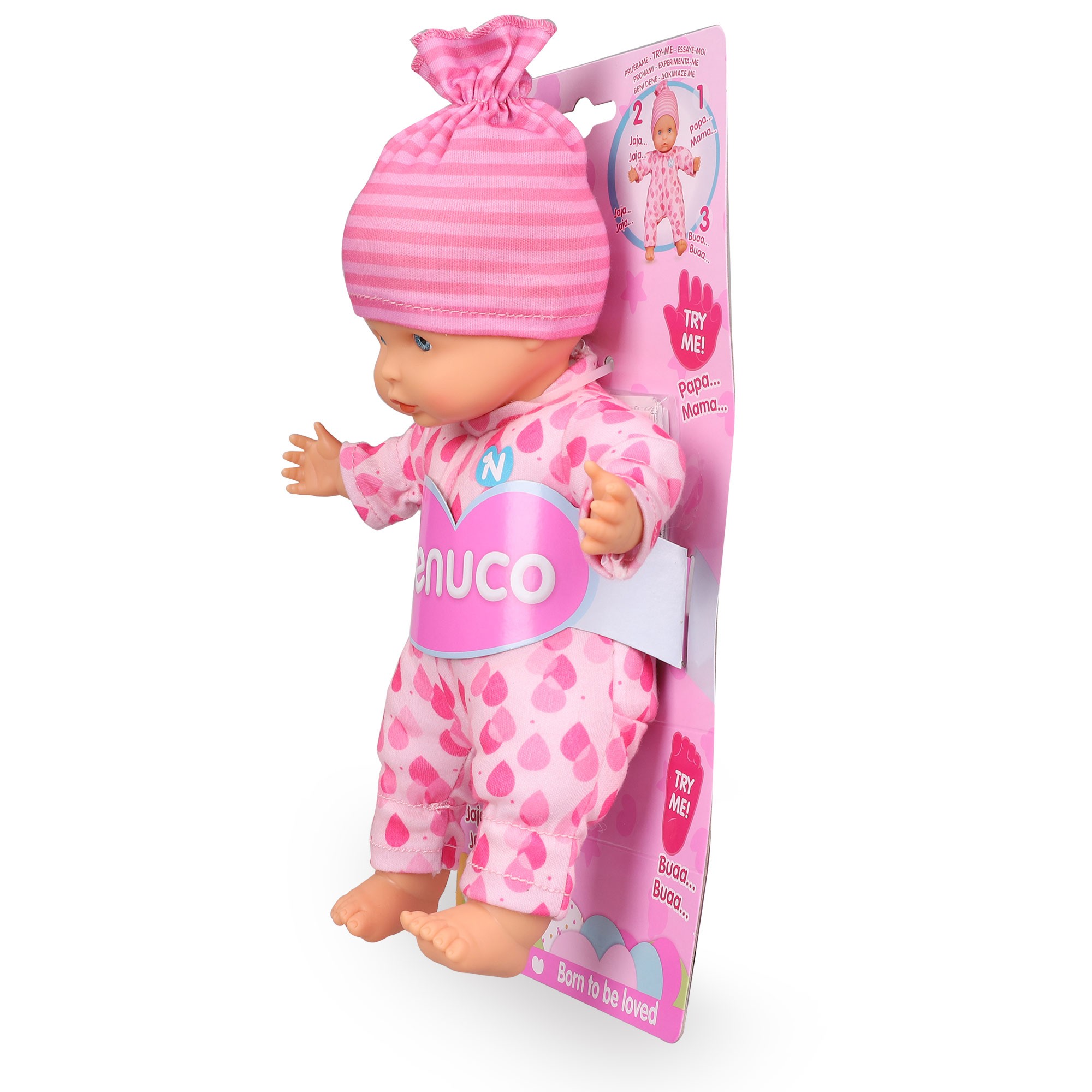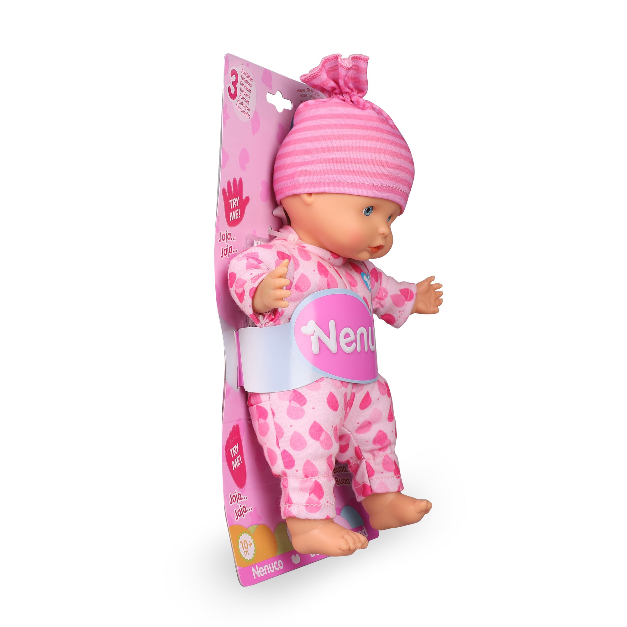 Nenuco blandito con tres funciones, cuando aprietas sus manos o sus pies el muñeco hace sonidos de bebé. Además, puede meterse el dedo en la boca como los bebés de verdad.