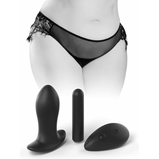 - Dimensiones del producto Panty: Fits sizes XL-2XL | Plug: 8.6 x 7.1 cm | Bullet: 7.6 x 1.8 cm | Remote: 7.6 x 3.4 cm